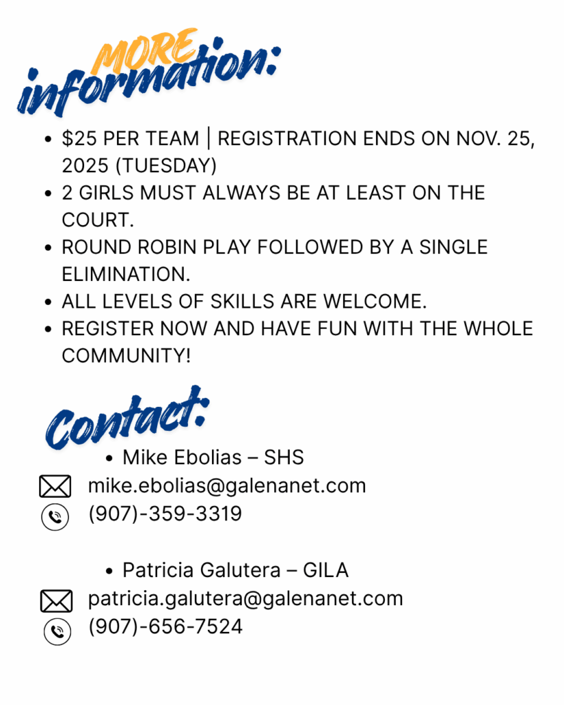 Galena families who are interested in hosting GILA students for Thanksgiving must pass a background check. If you have not passed the district background check already, please go to galenaalaska.org and fill out the GCSD Volunteer Form. Once you have passed, you can call 907-318-6697 to make arrangements to host students for the Thanksgiving holiday. Please complete the form by November 13th in order to pass the background check in time for Thanksgiving. If you are a GCSD employee, you are already approved to host GILA students. (10/23)
