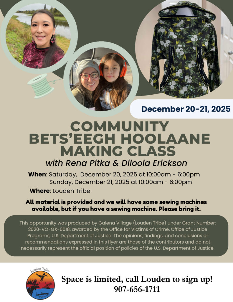NEW – The Louden Tribe is happy to announce that we are once again able to provide snow removal services for Elder Tribal Members! Resident Tribal Members 60 years of age or older may request snow removal services this winter. Members 70 years and older may also have their steps shoveled. You must sign a waiver before requesting services so please call the office at 907-656-1711 to set up a time to review and sign. This service is only available during regular business hours Monday – Friday. Baasee’ for your patience as we worked to get the plow fixed! (11/17)