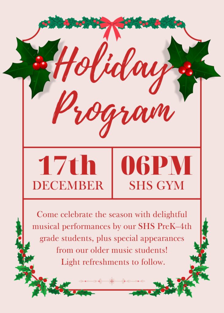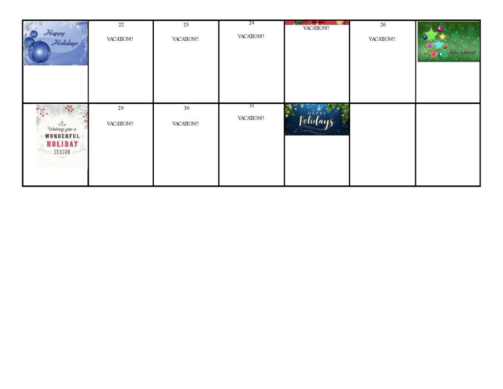 - Wednesday, December 24th at 11 AM. Early dismissal for Christmas program.
