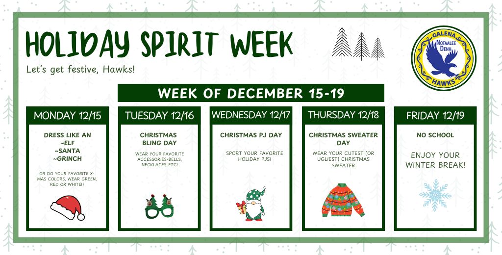 NEW – The SHS Holiday Program is coming up! All students Prek-4th will perform, in addition to some older students. All students performing need to arrive at 5:45pm and go directly to their classrooms to get ready with their performing groups. Also-Toys for Tots will be happening at this event! There will be a gift for every child in Galena 0-18, so please encourage any families you know to join us! (12/12)