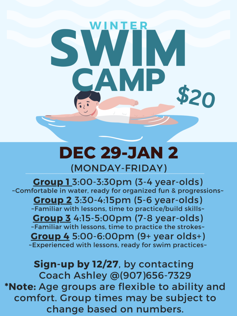 For pool rental please contact Sandy @907-656-7100 a week prior to desired date.