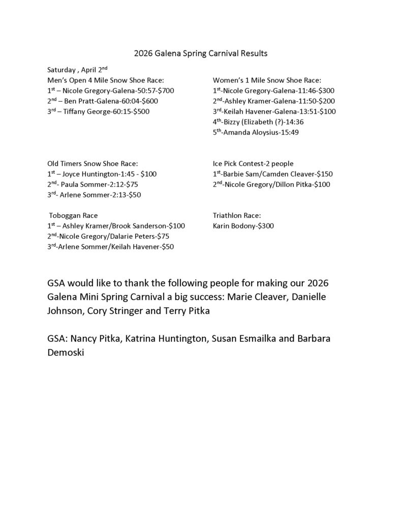 NEW – A message from the Galena Pool: There will be no open swim Friday 4/10 or Saturday 4/11 due to basketball games and multiple other activities. (4/6)