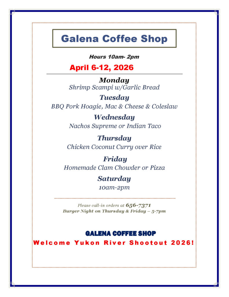 NEW – Paula Bifelt is looking for 2 passengers for Huslia this weekend. Depart Galena Thursday 5 pm, return Sunday 4 pm. Give Paula a call at (907) 656-7076.