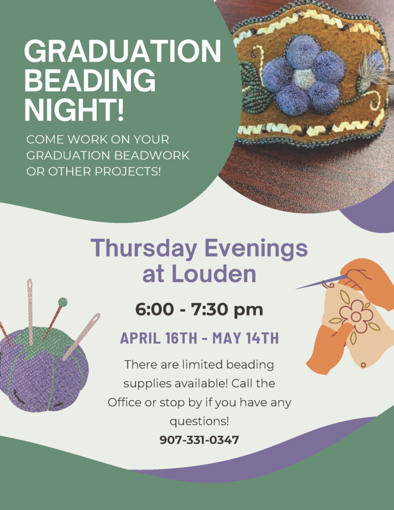 NEW – The Louden Tribe will be hosting Beading Nights on Thursdays from 6:00 – 7:30 pm starting April 16th – May 14th. Come work on your graduation projects, beading, sewing or just stop by to visit! There will be limited beading supplies available. Call the Louden Tribal Office if you have any questions at 907-331-0347. (4/6)