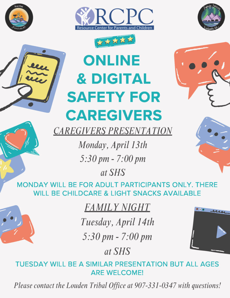 NEW – Join us at SHS April 13th and 14th for a presentation on Online & Digital Safety for Caregivers. The Resource Center for Parents and Children will be sharing valuable information on how to keep your kids safe online. April 13th will be a presentation for adult participants only with childcare and light snacks provided. A similar presentation will be given on April 14th but all ages and families are welcome! Both presentations will be from 5:30 – 7 pm in the SHS gym. Please contact the Louden Tribe at 907-331-0347 with any questions. (4/2)