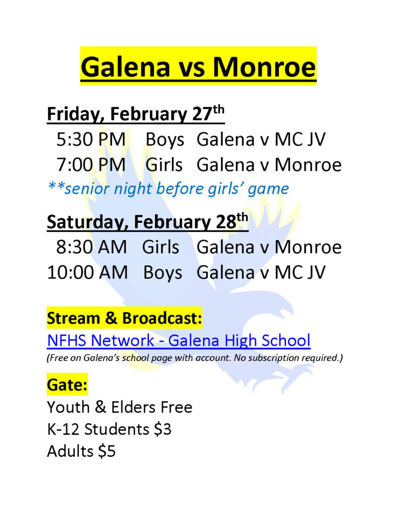 NEW – There is high school basketball action on the slate for this weekend in Galena, with Monroe Catholic JV boys and varsity girls coming to town for games Friday night and Saturday morning. Confirmed game times will be posted here soon.