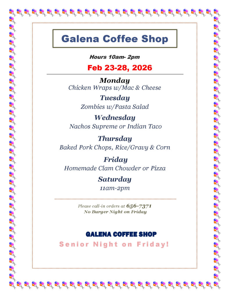 NEW – During Lent, St John Berchman’s Catholic Church in Galena will have daily Mass or prayer service at 11:30 followed by the Rosary at Noon on Monday, Tuesday and Thursday. Rosary will be at 7 p.m. on Wednesdays at the Elders Center and Stations of the Cross will be on Fridays at noon in the church. The Elders Center will host Mass on Saturdays at 4 pm, and Mass starts Sunday at church at the normal time of 11 am. (2/16)
