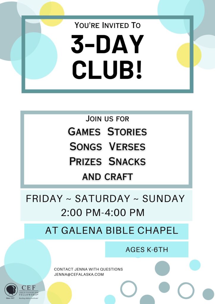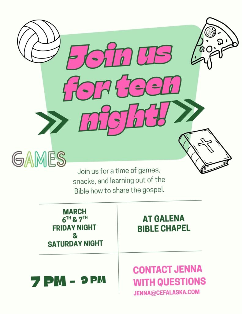 Galena Bible Church Youth group is up and running for all kids in middle school and high school! Youth Group meets at the Bible Church on Wednesday nights from 7-9pm for games, worship, and a Bible lesson! For more information contact Amanda Martin 907-521-1155. (9/3)