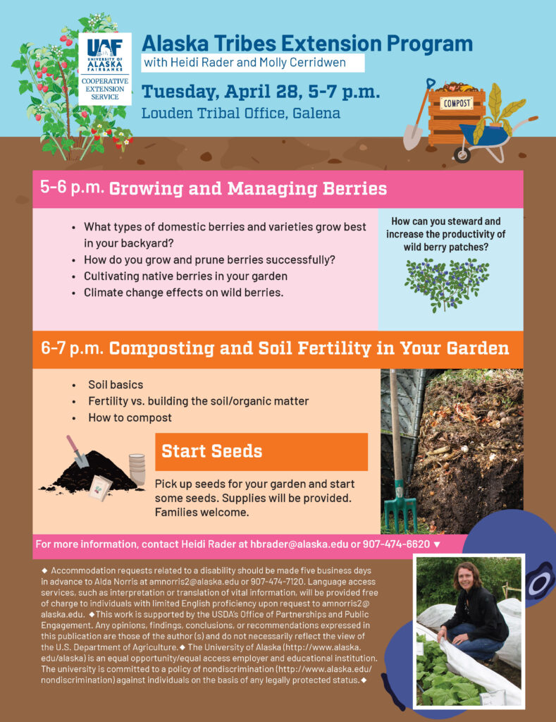 NEW – UAF Cooperative Extension will be hosting a seed starting event Tuesday, April 28th from 5-7 pm at the Louden Tribal Office. We’ll be discussing growing and managing berries in your own backyard along with presenting information on composting and soil fertility. (4/21)