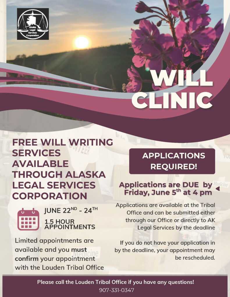 NEW – Alaska Legal Services Corporation will be hosting a Will Clinic June 22nd – 24th at the Louden Tribal Office. Participants are required to have completed applications submitted by Friday, June 5th at 4 pm and there are limited appointment times available. Please contact the Tribal Office at 907-331-0347 for an application or to set up an appointment. (4/21)